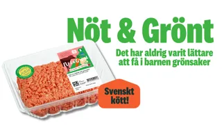 Nöt & Grönt är precis vad namnet lovar - en nötfärs som innehåller lika många delar nötkött som grönsaker (morötter och blomkål). Nötköttet kommer från svenska gårdar och har ursprungsmärkningen Kött från Sverige. Färsen är dessutom Nyckelhålsmärkt vilket betyder att den innehåller mindre salt samt mindre och nyttigare fett. Nöt & Grönt smakar precis lika gott som vanlig färs, utan att tumma på pris och kvalitet. Bra för både dig och din plånbok!