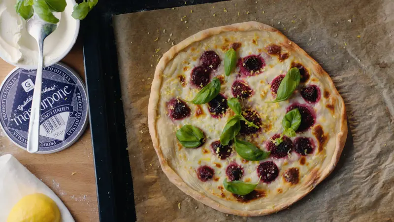 Dessertpizza med mascarpone, jordgubbar & basilika