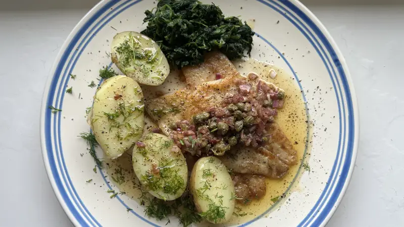 Laga Siri Barjes recept på stekt gulskädda med kokt potatis. Som pricken över i:et serveras alllting med ett brynt smör med rödlök och kapris samt vitlöksspenat. En enkel fiskrätt som passar perfekt både till vardags och att bjuda på.