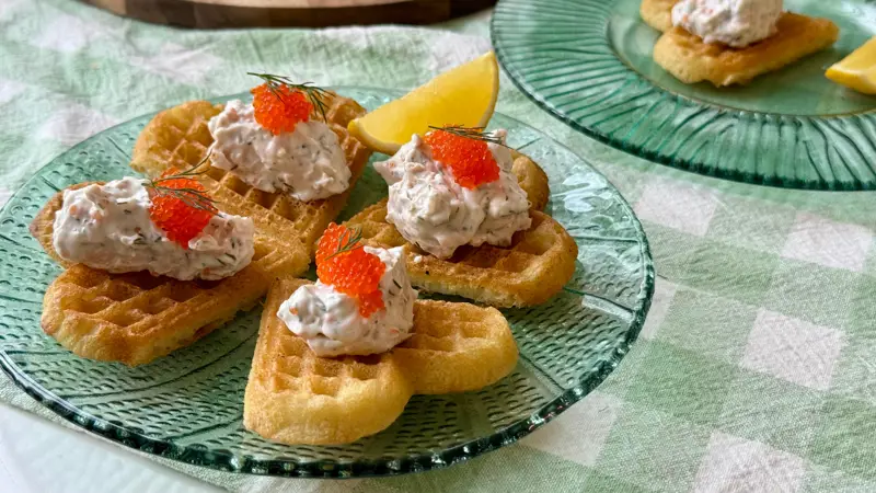 Frasiga och ostfyllda våfflor som gräddas till gyllene. Kan det bli godare än så? Dessa matiga våfflor serveras med vegansk skagenröra, tångcaviar, dill och citron.