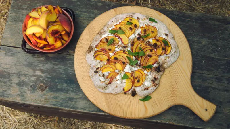 Siri Barjes recept på pizza med bakad persika, ricotta och honung. En söt efterrättspizza som påminner om värmen i Italien. Med vår färska, färdiga pizzadeg bakar du din persikopizza enkelt hemma på 15 minuter.