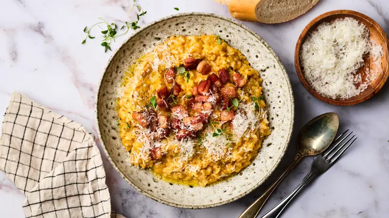 En krämig risotto går alltid hem! I det här receptet smaksätts risotton med vår pumpakräm Crema di zucca och serveras med krispig pancetta och parmesanost. En perfekt rätt att bjuda på!