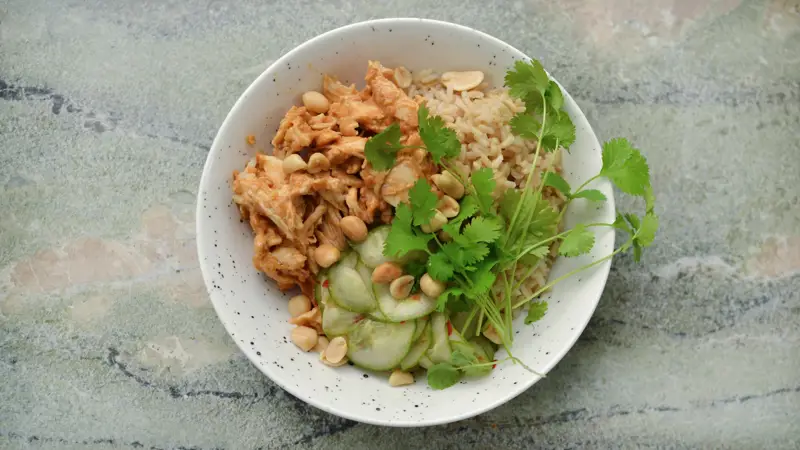 Shredded chicken är ett riktigt bra hack! Kycklingen kokas i buljong och dras sedan isär och vips så har du ett protein som funkar till allt! I detta recept blandar vi kycklingen med jordnötssås och serverar med en syrlig gurksallad och ris. Om du får kokt kyckling över passar den perfekt att ha dagen efter i en matig omelett!
