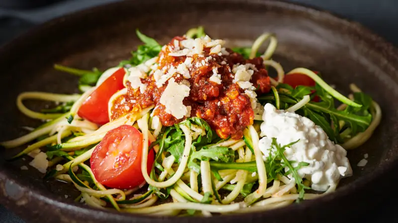 Med en knaprig färs på valnötter och fräsch zucchinispaghetti rör du dig helt bort från spisen i denna elfria tappning av den klassiska vardagsrätten.