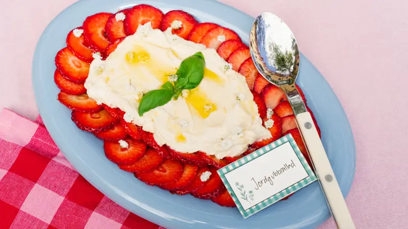 Jordgubbar är ett måste på midsommarfirandet - det är sen gammalt! Marinera dem och servera med vispad ricotta smaksatt med olivolja, basilika och balsamvinäger. Mums! Receptet räcker till ca 4-6 portioner.
