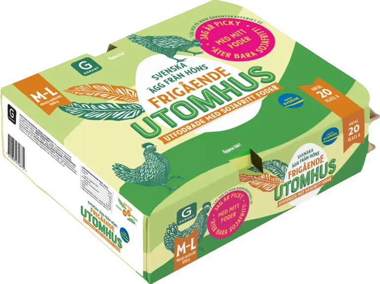 20-pack ägg från frigående höns utomhus. Utfodrade med sojafritt foder. Mediumstora och stora ägg från Sverige.
