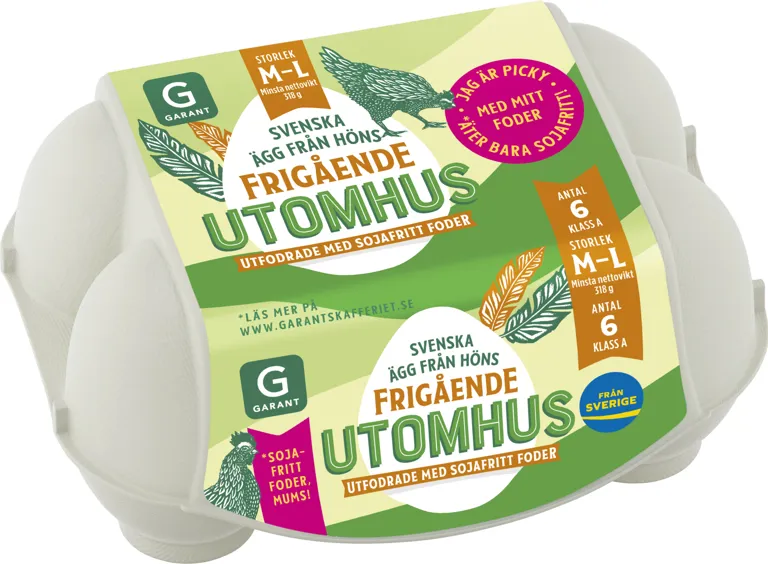 6-pack ägg från frigående höns utomhus. Utfodrade med sojafritt foder. Mediumstora och stora ägg från Sverige.