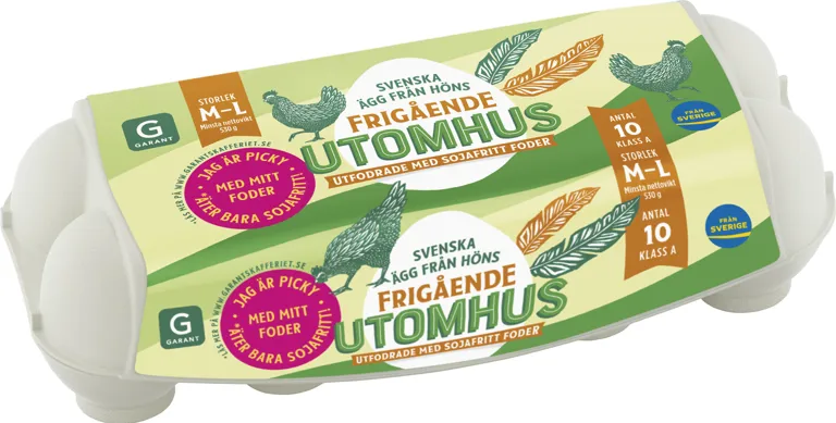 10-pack ägg från frigående höns utomhus. Utfodrade med sojafritt foder. Mediumstora och stora ägg från Sverige.