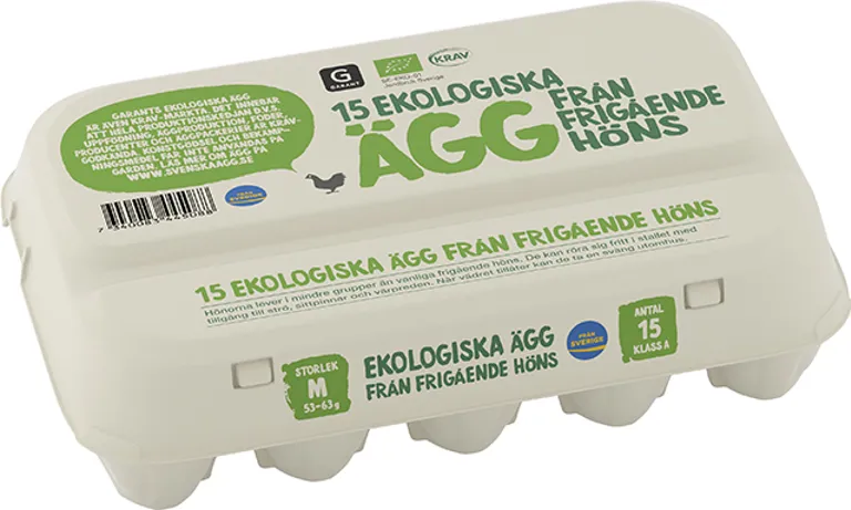 15-pack ekologiska ägg från frigående höns utomhus. Mediumstora från Sverige.