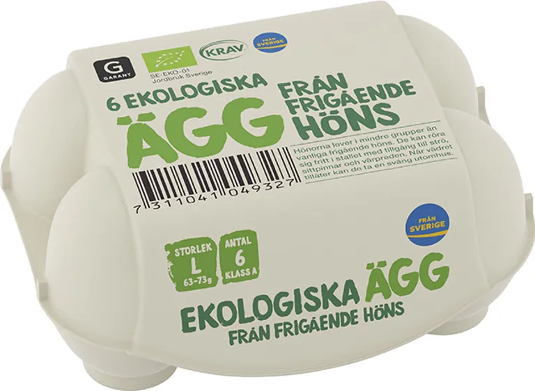 6-pack ekologiska ägg från frigående höns utomhus. Stora ägg från Sverige.