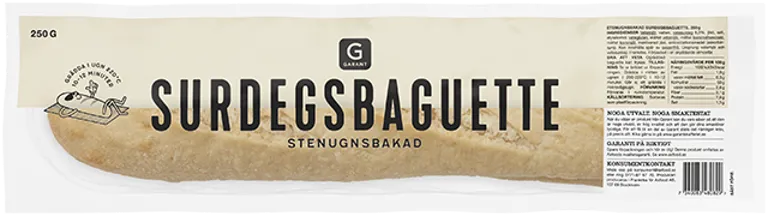 Stenugnsbakad surdegsbaugette. Gräddas i ugnen. 250 gram.