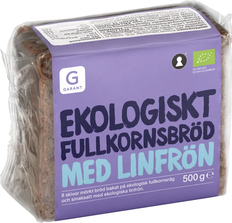 Ekologiskt fullkornsbröd med linfrön. Bakat på ekologiskt fullkornsråg och smaksatt med ekologiska linfrön. 8 skivor.