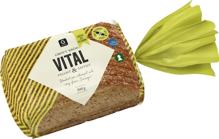 Grovt osötat bröd i skivor med 22% fullkorn.Fylligt och saftigt. Bakat med vetemjöl och råg från Sverige. 500 gram.