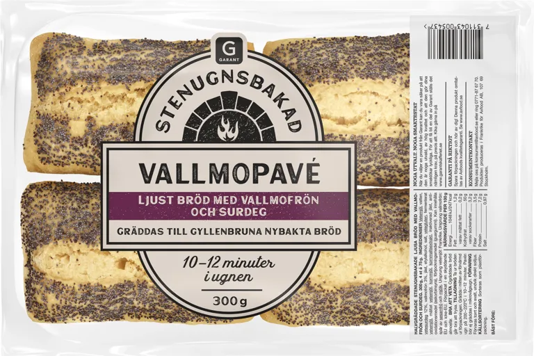 Stenugnsbakad vallmopavé. Ljust bröd med vallmofrön och surdeg. Gräddas till gyllenbruna nybakta bröd i 10-12 minuter i ugnen. 300 gram.