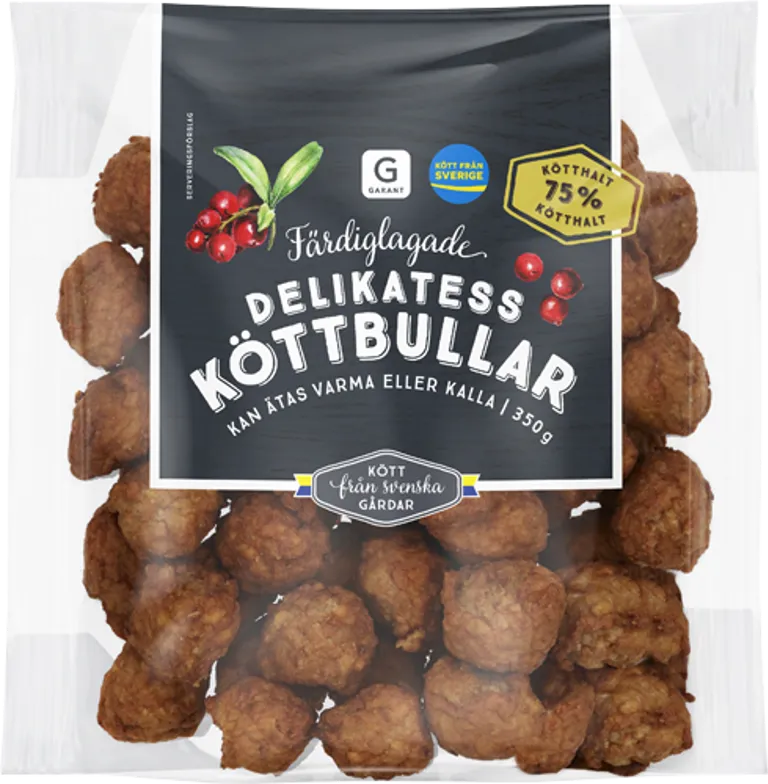 Färdiglagade delikatessköttbullar. Kan ätas varma eller kalla. Kött från svenska gårdar. 450 gram.