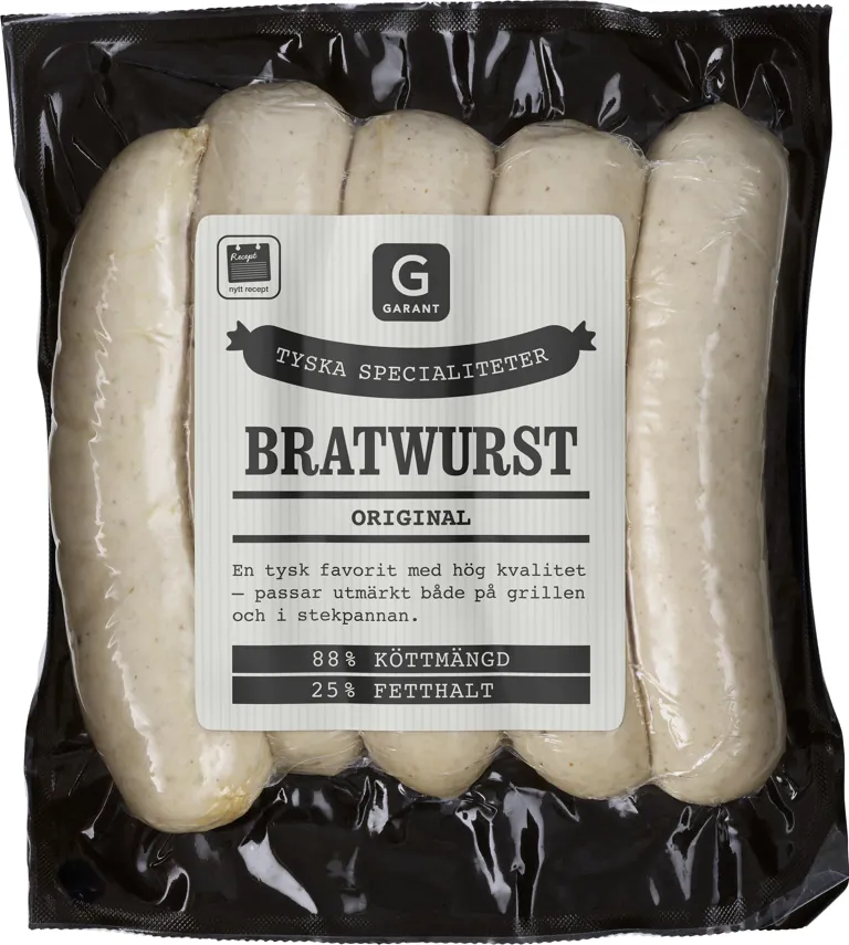 : Kött från gris, vatten, salt, kryddor (libbsticka, lök, palsternacka, kummin, chilipeppar, ingefära, muskotnöt, mejram, paprika, svartpeppar, druvsocker, glukossirap, stabiliseringsmedel (E450), naturtarm. Kan innehålla spår av SENAP och SELLERI. Köttursprung: Tyskland.