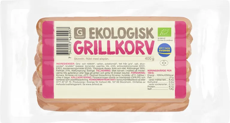 Ekologisk skinnfri grillkorv. Rökt med alspån. Svenskmärkningen visar att köttet i produkten kommer från djur som är födda och uppfödda i Sverige. Produkten är även förädlad och förpackad i Sverige.