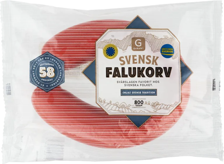 Klassisk falukorv enligt svensk tradition. 58% hög kötthalt med kött från Sverige. 800 gram.