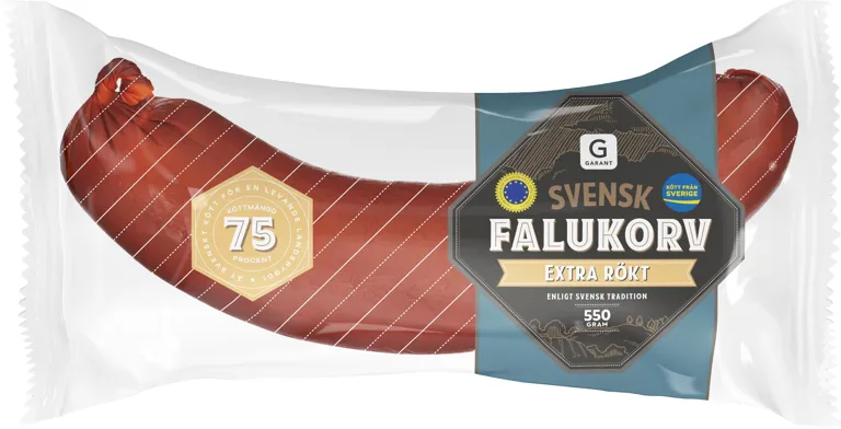 Svensk falukorv extra rökt gjord på nöt- och fläskkött med 75% köttmängd. Märket Kött från Sverige visar att köttet i produkten kommer från djur som är födda och uppfödda i Sverige. Produkten är även förädlad och förpackad i Sverige.