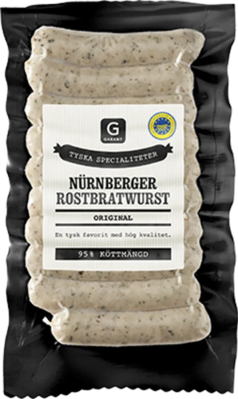 En tysk favorit med hög kvalitet på 95 % köttmängd. Passar utmärkt på grillen eller i stekpannan. Vår Nürnberger Rostbratwurst är märkt med skyddad geografisk beteckning. Denna originalkorv är den del av vårt skafferi av Tyska Specialiteter.