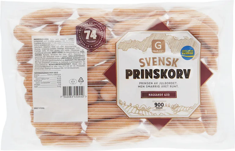 Svensk prinskorv. 74% hög kötthalt med kött frånn Sverige. Naggande goda! 900 gram.