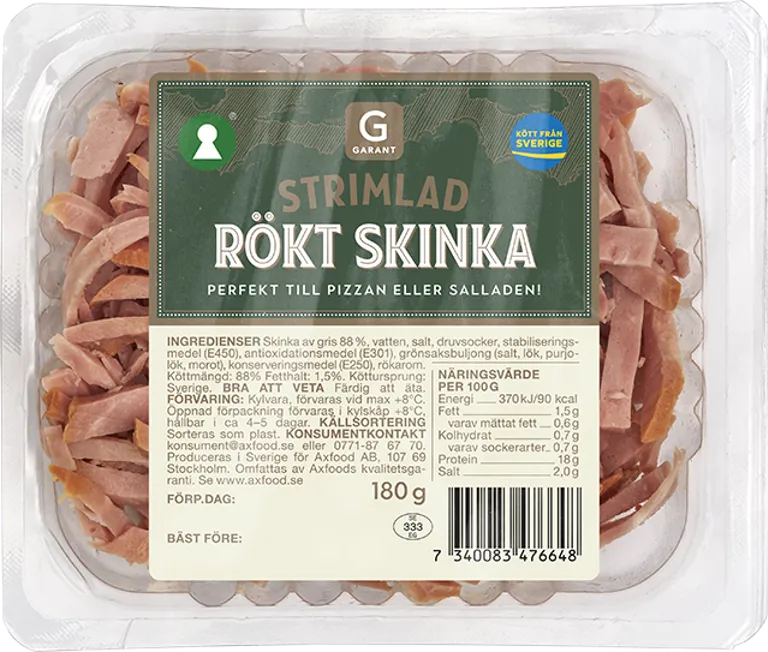 Skinka av gris 88%, vatten, salt, druvsocker, stabiliseringsmedel (E450), antioxidationsmedel (E301), grönsaksbuljong (salt, lök, purjolök, morot), konserveringsmedel (E250), rökarom. Köttmängd: 88%. Fetthalt: 1,5%. Kötturspung: Sverige.