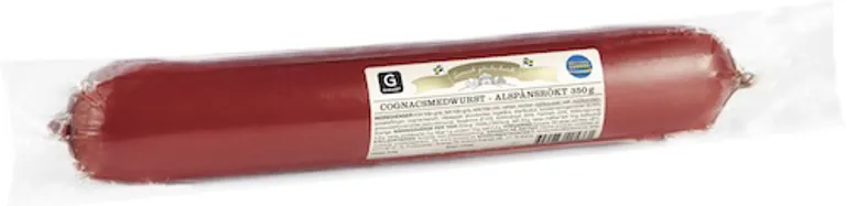 Alspånsrökt klassisk cognacmedwurst gjord på svenskt kött. Korven kallröks för att få fram sin behagliga smak av cognac. Köttmängd 65 %.