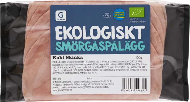 Smakrik kokt skinka med kött från svenska gårdar. Dessutom är skinkan ekologiskt vilket innebär att köttet framställs med höga krav på djuromsorg och djurhållning. Garants ekomärkning talar om att en vara är ekologisk och ibland även KRAV-märkt. Vårt sortiment fylls hela tiden på med fler EKO-varor.