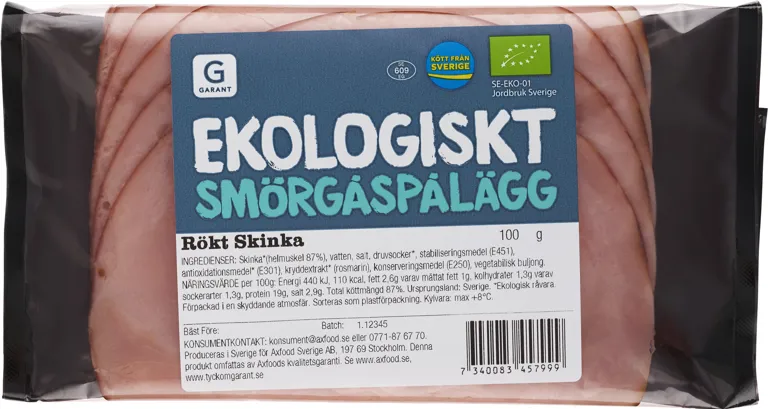 Ekologisk svensk skinka rökt på traditionellt sätt som passar utmärkt till frukostmackan. Fetthalt 3 %. Skinkan är ekologisk vilket innebär att köttet framställs med höga krav på djuromsorg och djurhållning. Garants ekomärkning talar om att en vara är ekologisk och ibland även KRAV-märkt. Vårt sortiment fylls hela tiden på med fler EKO-varor.
