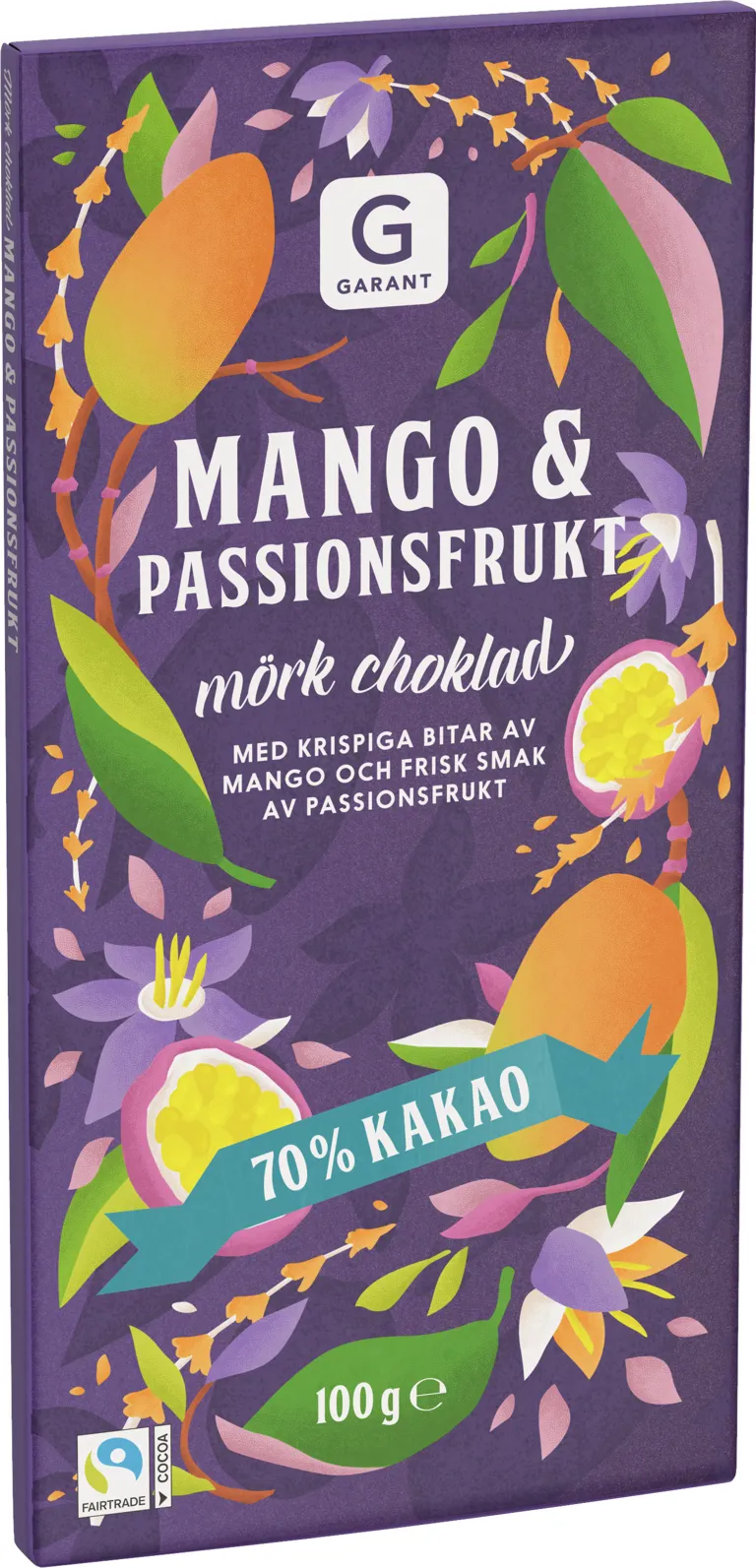 Mörk choklad 70% med smak av mango och passion. Med krispiga bitar av mango och frisk smak av passionfrukt. 100 gram.