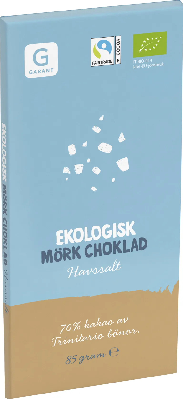Ekologisk mörk choklad med havsalt. 70% kakao av Trinitariobönor. 85 gram.