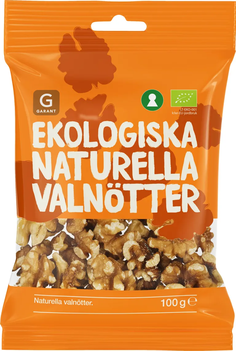 VALNÖTTER*. ‘Ekologisk råvara. Kan innehålla spår av JORDNÖT, SÖTMANDEL, HASSELNÖT, CASHEWNÖT, PEKANNÖT, PARANÖT, PISTASCHNÖT och MAKADAMIANÖT.