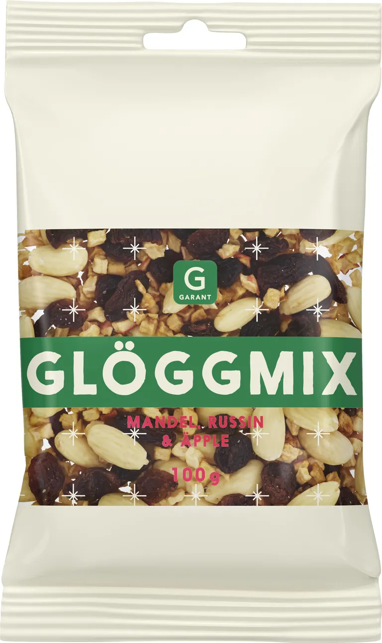 Blancherad MANDEL 45%, russin 35% (russin, solrosolja), torkade äppelbitar 20%. Kan innehålla spår av GLUTEN, JORDNÖTTER, SOJA, MJÖLK, HASSELNÖTTER, VALNÖTTER, CASHEWNÖTTER, PEKANNÖTTER, PARANÖTTER, PISTASCHNÖTTER och MACADAMIANÖTTER.