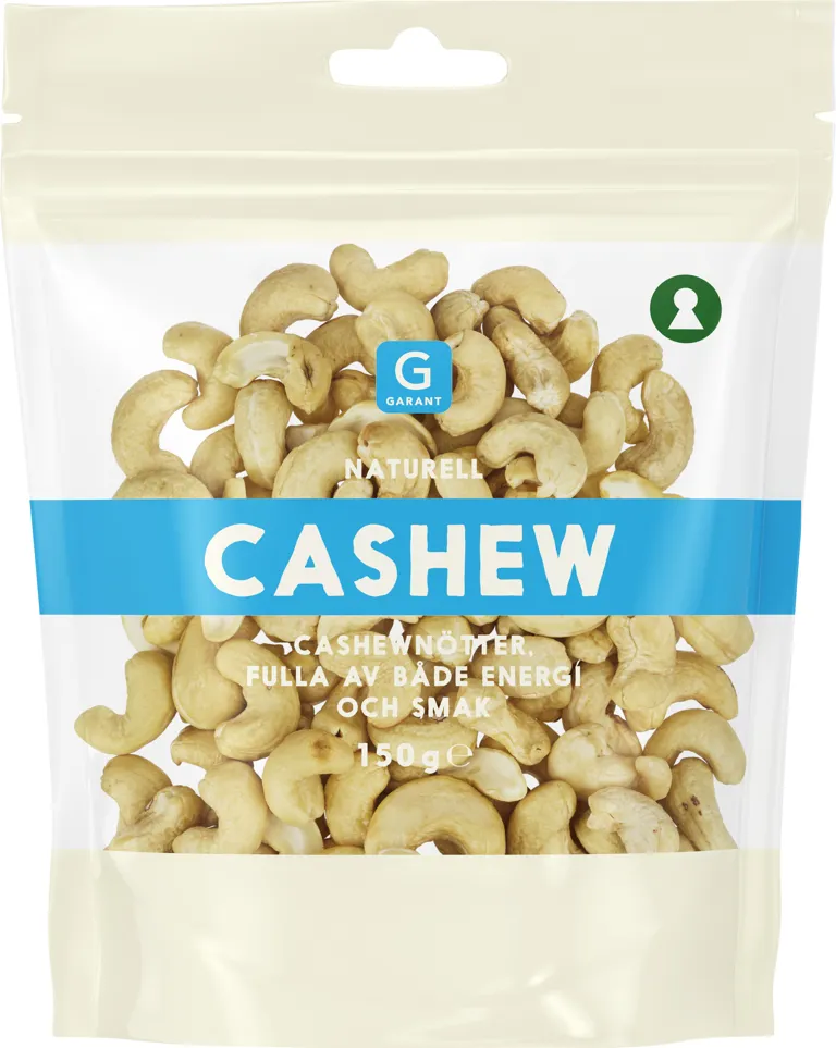Naturella cashewnötter. Fulla av både energi och smak. 150 gram.