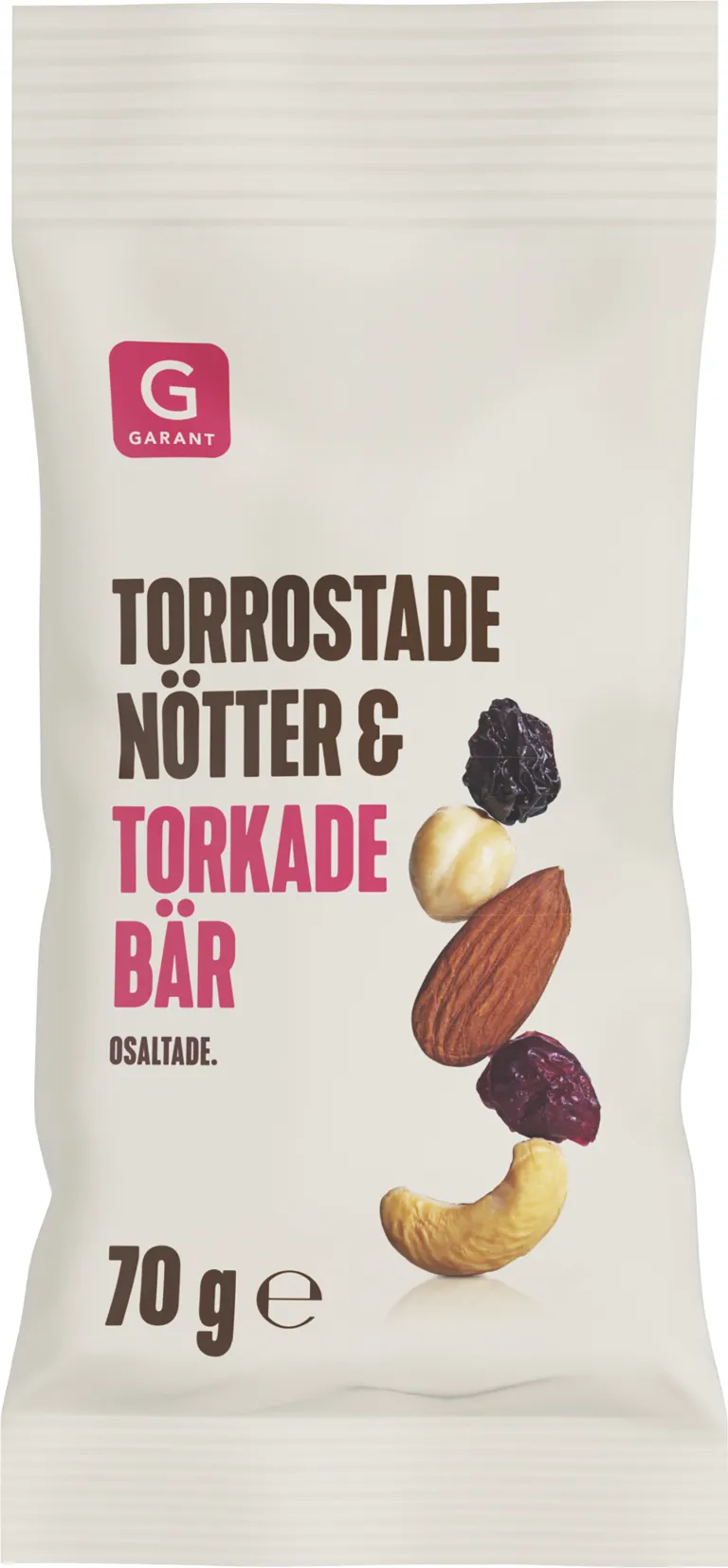Nöt & bärmix med torrostade nötter och torkade bär. Innehåller mandel, cashew, hasselnötter, tranbär och russin. Osaltade. 70 gram.