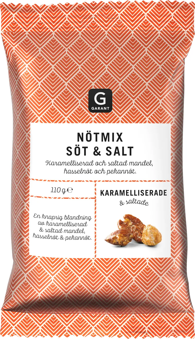 Söt och salt nötmix. Karamelliserad och saltad mandel, hasselnöt och pekannöt. 110 gram.