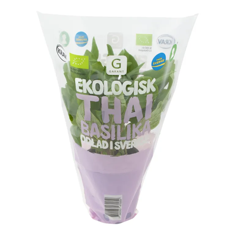 Ekologisk thaibasilika i kruka. Odlad i Sverige.