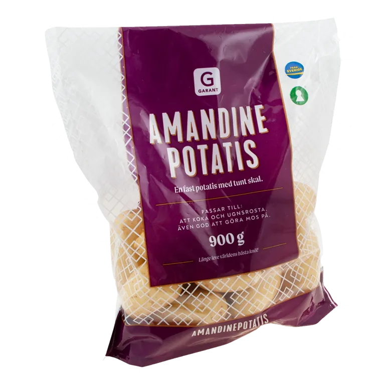 Amandine potatis med tunt skal. Passar till att koka, ugnsrosta och göra mos på. Klass 1. 900 gram.