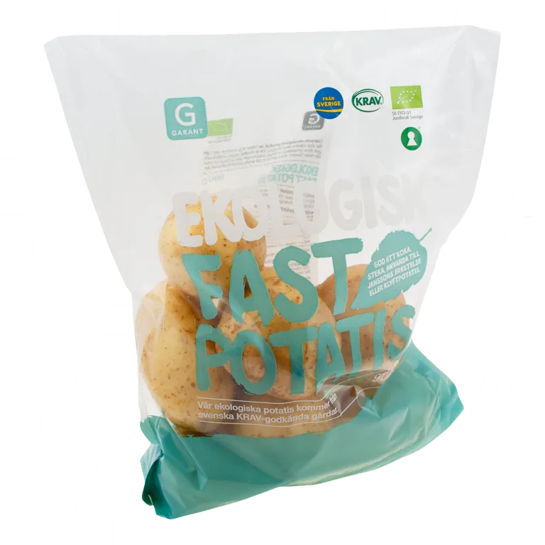 Ekologisk fast potatis från svenska KRAV-godkända gårdar. God att koka, steka, till Jansson frestelse eller klyftpotatis 900 gram.