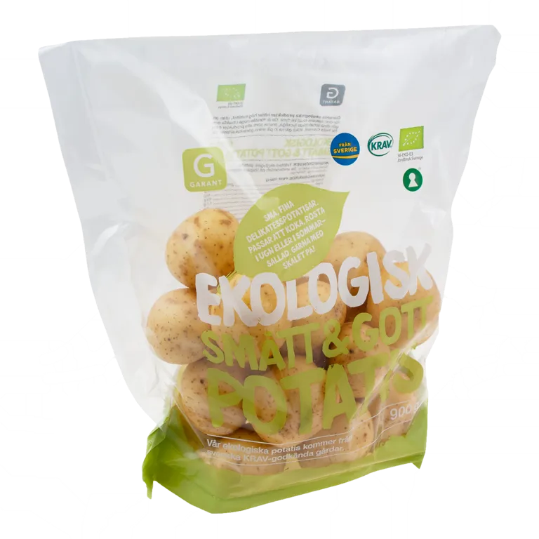 Små fina ekologiska delikatess potatisar från svenska KRAV-godkända gårdar. Passar till att koka, rosta eller i en sallad. Gärna med skalet på. 900 gram.