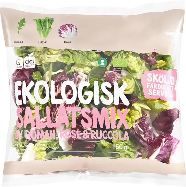 Ekologisk salladsmix av roman, lollo rosso och röd mangold. Från utvalda odlingar. 150 gram.