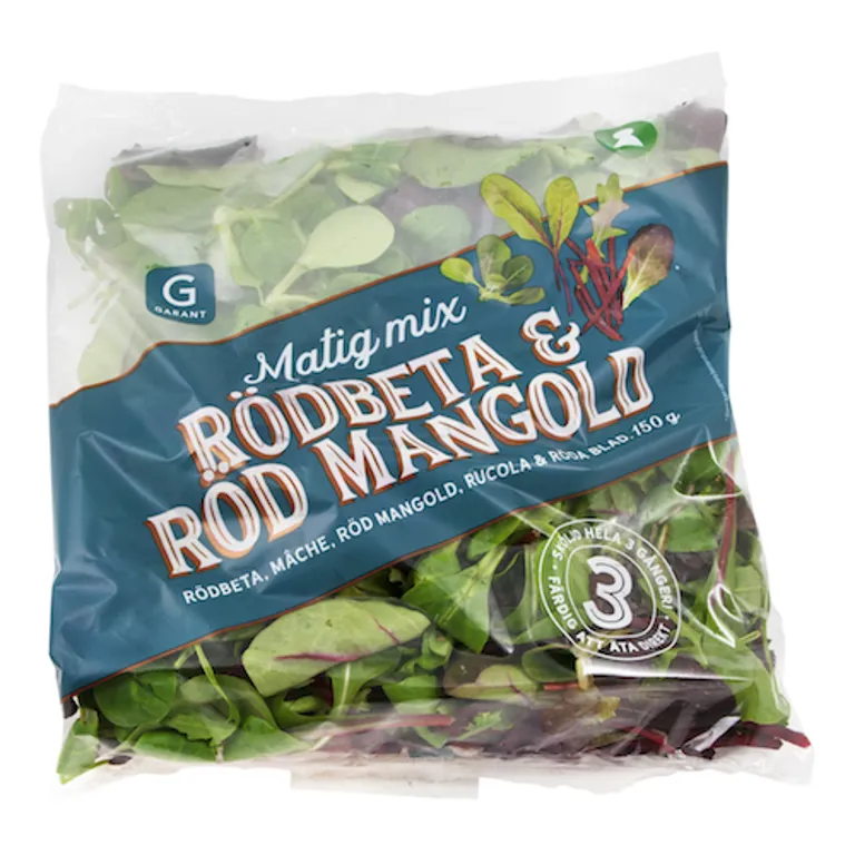 Rödbeta & röd mangold mix med rödbeta, maché, röd mangold, rucola och röda blad. 150 gram.