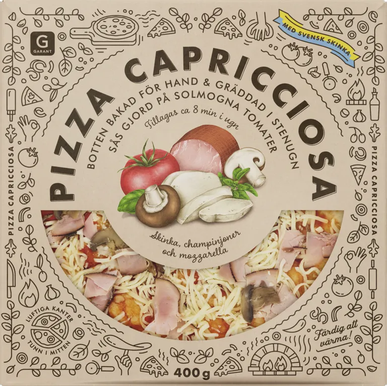 Färsk pizza capricciosa med skinka, champinjoner och mozarella. Botten bakad för hand och gräddad i stenugn. Sås gjorda på solmogna tomater. 400 gram.