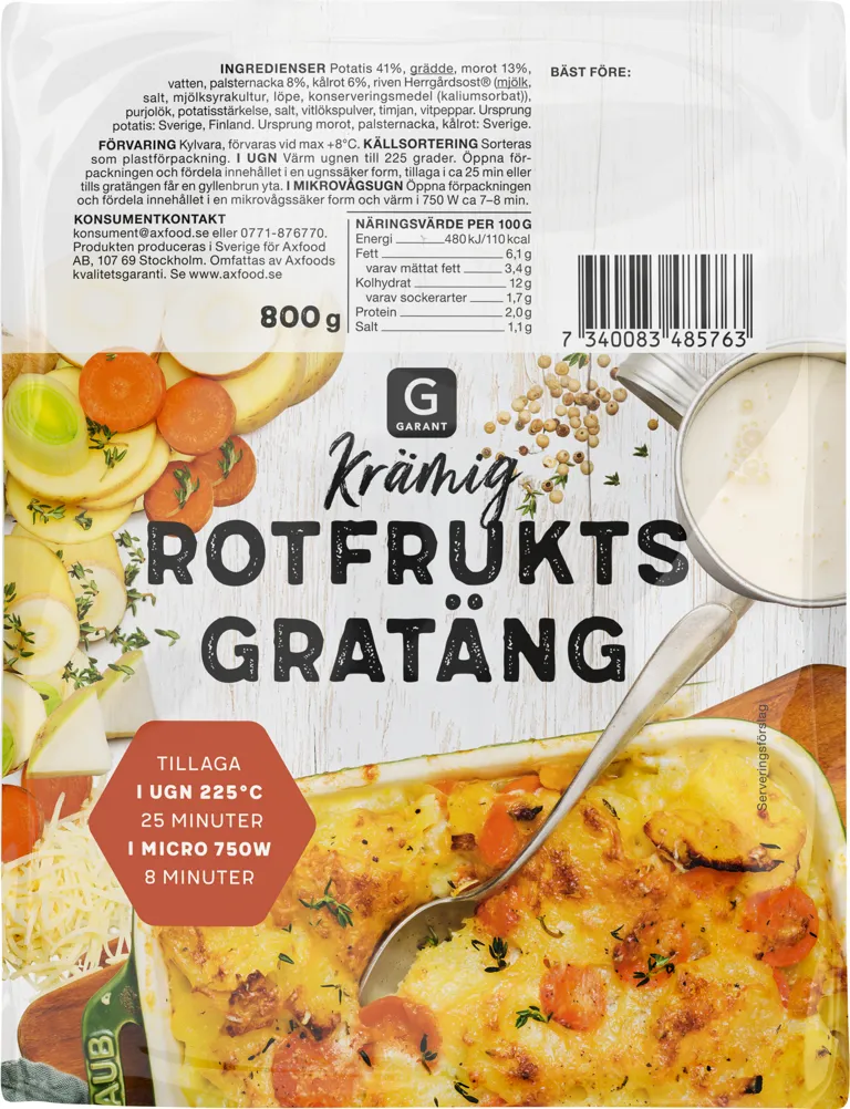 Krämig rotfruktsgratäng. Tillagas i ugn eller micro. 800 gram.