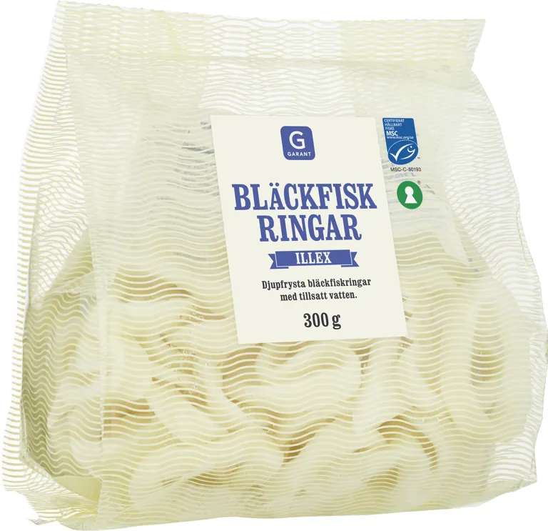 Djupfrysta bläckfiskringar med tillsatt vatten. 300 gram.