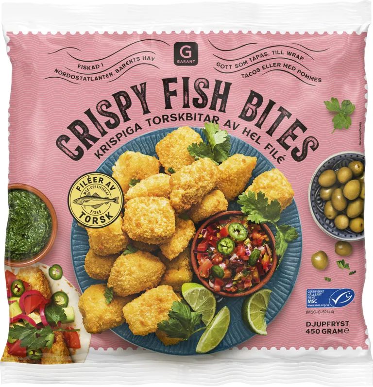 Crispy fish bites av torskfilé. Goda som tapas, till wrap, tacos eller med pommes. Fiskad i Nordostatlanten, Barents hav. 450 gram.