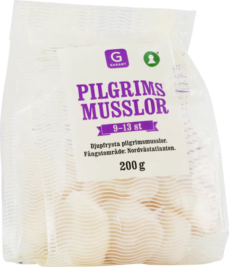 Pilgrimsmusslor (Placopecten magellanicus)* *Fångstområde: Nordvästatlanten (FAO 21) Pilgrimsmusslorna är försedda med en tunn ishinna, för att skydda mot uttorkning. Glaseringen ingår inte i nettovikten.