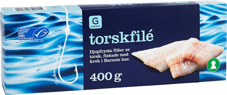 Djupfryst torskfilé. Renskurna portionsbitar av torsk. 400 gram.