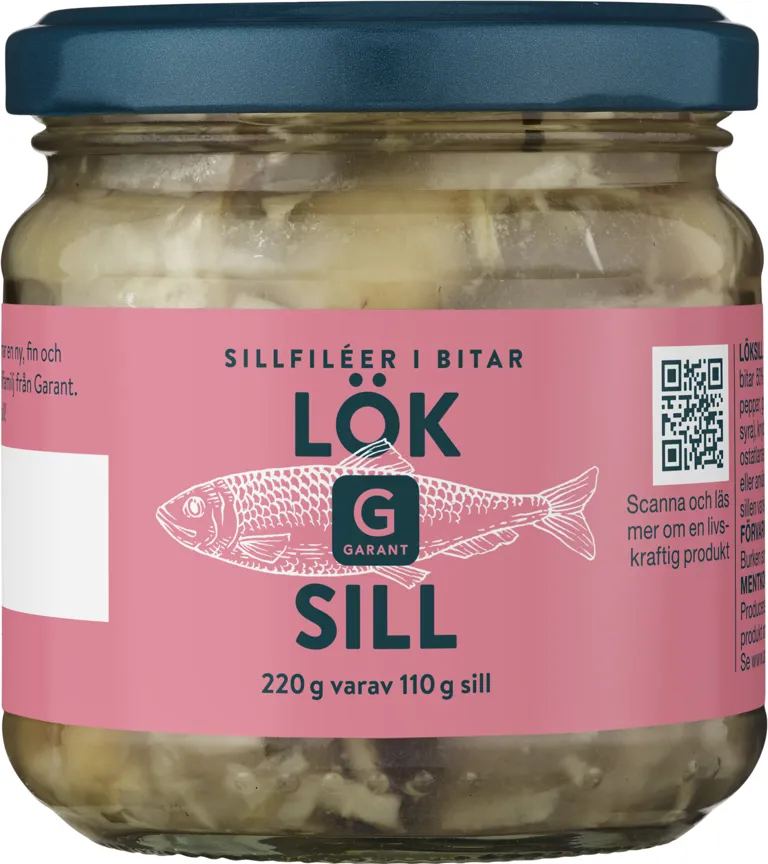 Sillfiléer i bitar med smak av lök. 220 gram varav 110 gram sill.