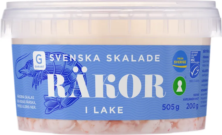 Svenska skalade räkor i lake. MSC-märkta och nyckelhålsmärkta. 505 gram varav 200 gram räkor.